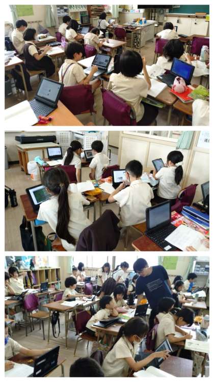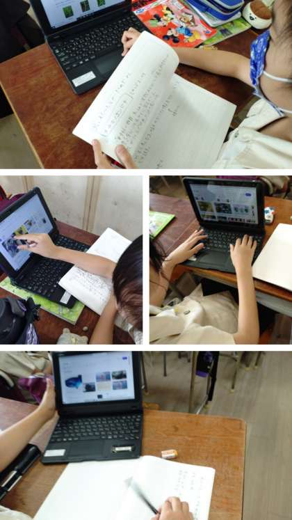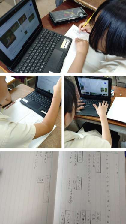 国語科の時間は、動物や昆虫、魚や植物など、自分の好きな生き物を学習者用端末で調べて、分かったことや、考えたことをリーフレットにまとめていきます。