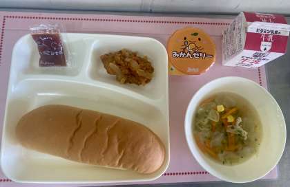 7/4(金)の給食は、牛乳、牛丼、もやしとピーマンのごまいため、大福豆の煮物です。
