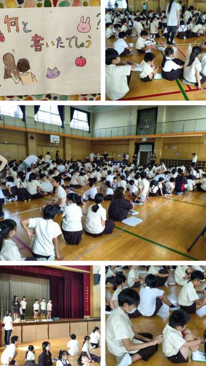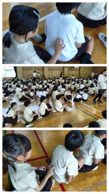 集会委員がひらがな1文字を班長だけに見せ、班のメンバーが順番に背中に指で書いて伝えていくゲームです。