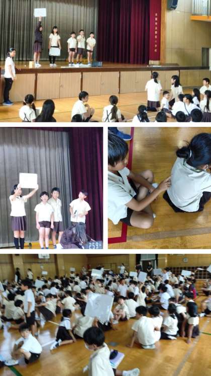 毎週木曜日に、全校児童がたてわり班ごとに講堂に集合して児童集会を行っています。