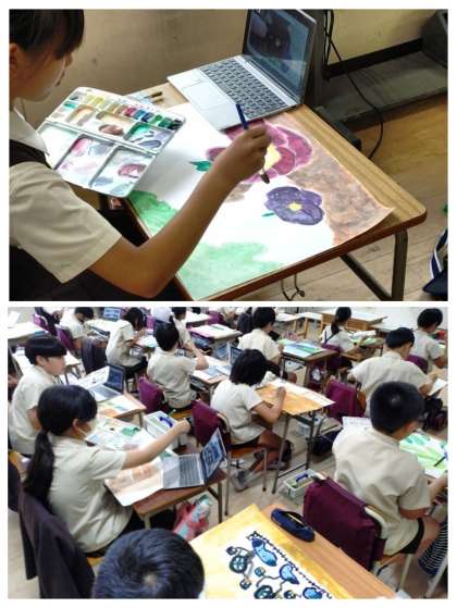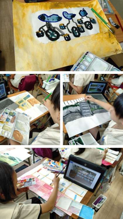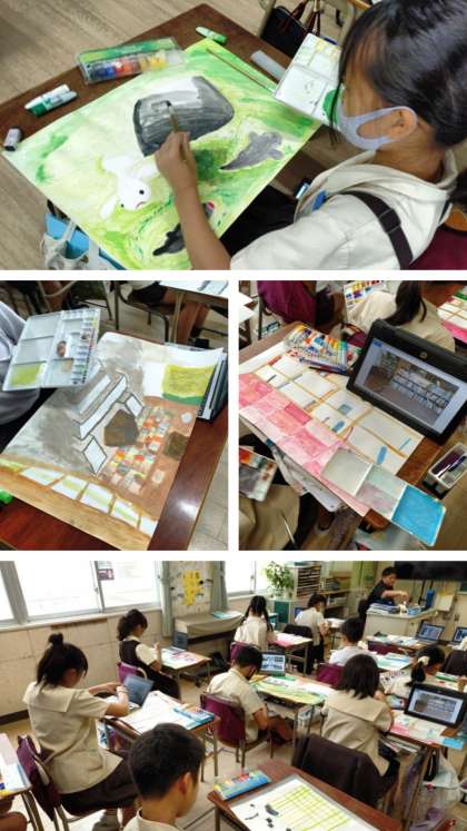 学校の好きな場所の写真を見ながら、おすすめしたいことが友達に伝わるように画用紙に絵を描いています。