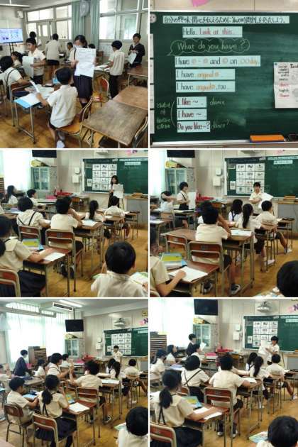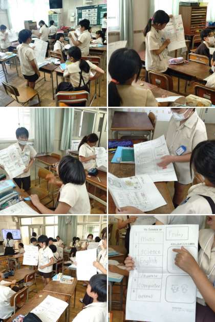今日は、"Hello.Look at this.""What do you have?""I have・・・and・・・on ○○day."・・・などの表現を使って、自分の興味・関心を伝えるために、「私の時間割」を発表しました。