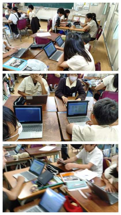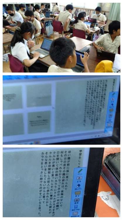学習の終わりに、クルルやカララたち登場人物の気持ちを追いながら読み取ったことをもとに、わかったことや考えたことを一人一人が学習用端末にまとめて交流しました。