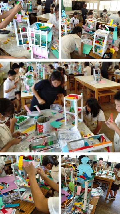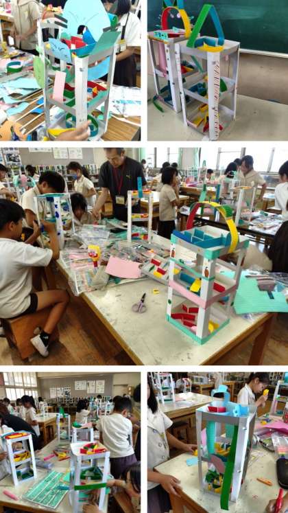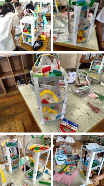 図工科の時間は、紙を切ったり貼ったりしてビー玉が転がる立体迷路を作っています。