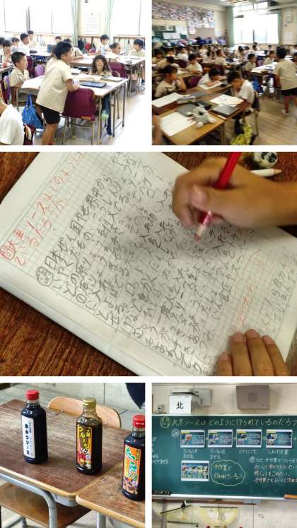 社会科の時間は、地元のソースメーカー「大黒屋」では、ソースがどのようにつくられているのか、資料をもとに調べました。