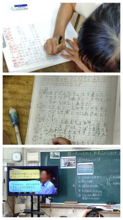 授業の後半は、お店から「安いソースを作ってほしい」という願いがあるにもかかわらず、ソースをつくっている人たちが、品質のよいソースにこだわっているのか、そのわけについてみんなで考えました。