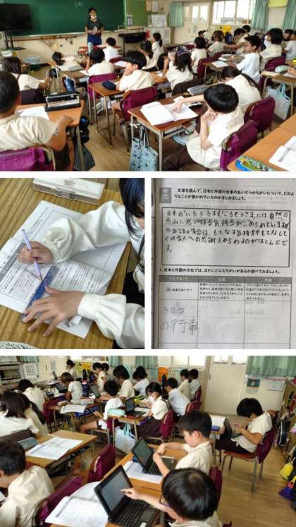 「総合的読解力」の学習では、「情報を読み取る・考えを形成する・考えを交流する・考えを表現する」といった言語力を育てることをねらいとして、大阪市が独自に作成した「総合的読解力育成カリキュラム」の教材を活用しながら様々なテーマで学習を進めています。