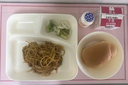 7/15(火)の給食はごはん、牛乳、豚肉と野菜の煮もの、ひじき豆、ささみとキャベツのごまみそ焼きです。