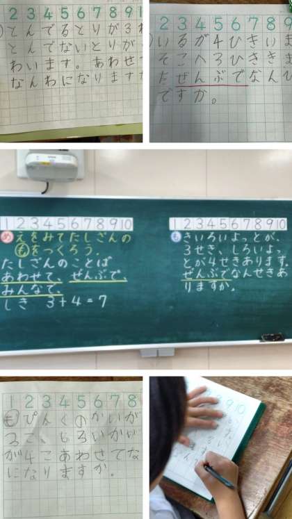 算数科の時間は、教科書の挿絵を見ながら、式が「3+4」になるたし算の問題を考えました。