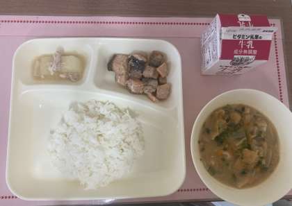 7/17の給食は、黒糖パン、牛乳、押麦のチキンパエリア、ウインナーとキャベツのスープ、ミックスフルーツです。