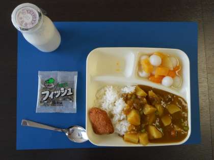 今日から給食が始まりました。1年生にとっては、初めての給食です。今日の給食は、入学いわいこんだてということで、新しくなかまになった1年生の入学をお祝いするこんだてでした。メニューは、○カツカレーライス ○フルーツ白玉 ○ミニフィッシュ ○牛乳です。1年生もしっかり噛んで食べることができました。