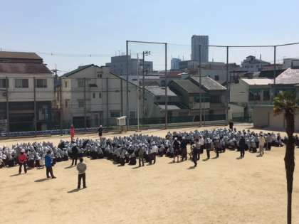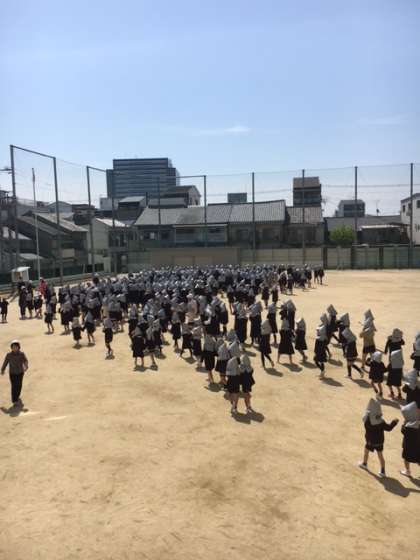 全員、防災頭巾をかぶり運動場へ避難しました。