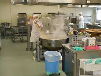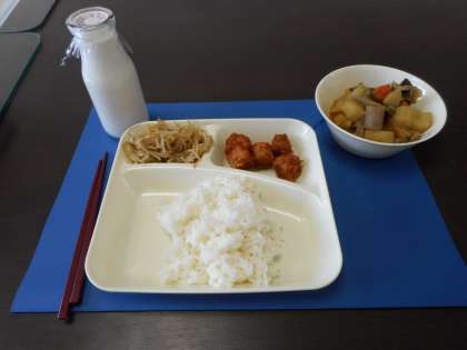 本日の給食メニューは、まぐろのオーロラ煮・じゃがいもと野菜の含め煮・もやしのあえもの・ご飯・牛乳です。まぐろのオーロラ煮は、熱した油であげたまぐろにケチャップ、砂糖、赤みそを合わせて煮たものをからませています。子どもたちにも人気の一品です。子どもたちの給食時間にあわせて、調理員さんが大きなしゃもじのようなもの(木櫂)で調理されています。給食は、栄養バランスのとれた昼食です。よく噛んで食べましょう。   (校長室より  4月14日)