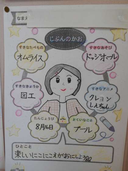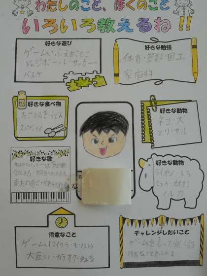 3年生、5年生のクラスでは、自己紹介カードを作成し教室に掲示しています。早く、クラスの友だちのことを知ってたくさんの友だちを作ってほしいと思います。