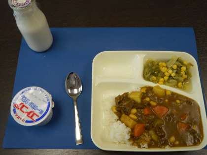 本日の給食メニューは、牛肉と大豆のカレーライス・レタスのサラダ・ヨーグルト・牛乳です。レタスのサラダは、砂糖・塩・りんご酢・うす口しょうゆを合わせてやや甘口の味付けになっています。
