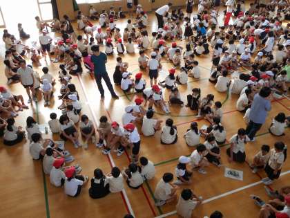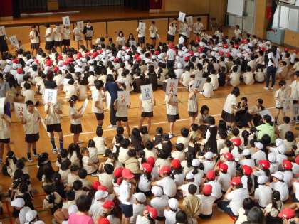 今年度初めての児童集会が行われました。今日は、縦割り班の編成です。1A班から 24B班まで全部で48の班があります。みんなで自己紹介をしました。自分の班と班長さんの名前が憶えられるかな?