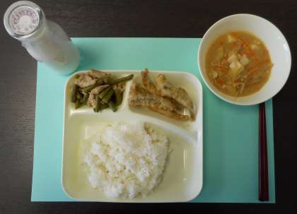 今日は、和風のメニューです。「イワシ天ぷら・味噌汁・豚肉とサンド豆の炒め物」