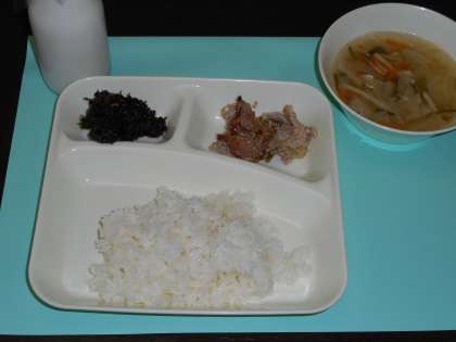 本日の給食メニューは、豚肉のごまみそ焼き・すまし汁・のりのつくだ煮・ご飯・牛乳です。のりのつくだ煮は、みりん、こい口しょうゆ、砂糖、お酒をベースにすまし汁としいたけのもどし汁も合わせてかつおぶし・きざみのりを加えて煮たもので、のり本来の風味が生かされた一品です。(校長室より 6月7日)