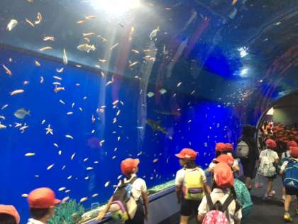いろいろな形、大きさ、色の魚がいて、子どもたちの目の前を泳ぎ去るたびに「おおーっ!!」と歓声を上げ、喜ぶ子どもたちでした。