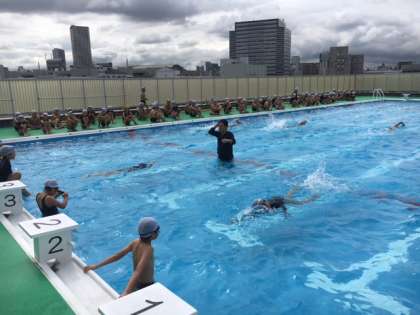 4時間目、3年生が入りました。プールの縦(25m)を一斉に泳ぐ子どもたち。元気いっぱい、クロールの練習をしていました。