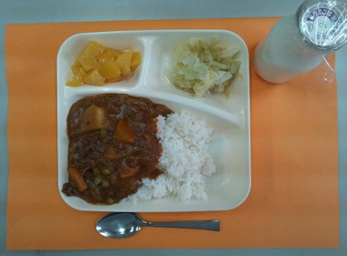 今日の給食は、ハヤシライスとキャベツのゆずドレッシング、黄桃(缶)、牛乳です。