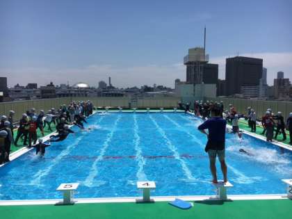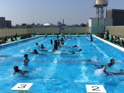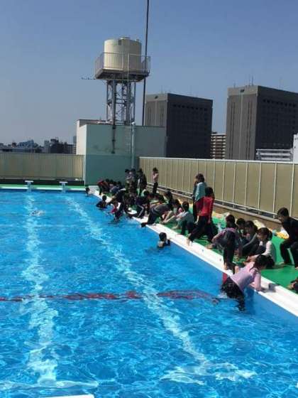 水の中では、服を着た状態だと体が思うように動きません。そのうえで「プールの水は透明だけど、川や池は視界がゼロに近い。」などという状況を想定しながら、子どもたちは取り組んでいました。