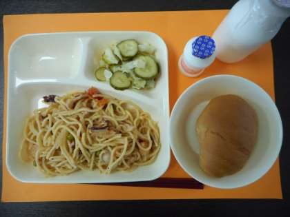 本日の給食は、シーフードトマトスパゲッティ・グリーンサラダ・発酵乳・1/2黒糖パン・牛乳でした。オリーブオイルとにんにくの香りが食欲を増進するスパゲッティは、トマトも入ってさっぱりとした味つけに仕上がっていました。トマトのビタミンCとカロテンで元気いっぱい過ごしてほしいと思います。子どもたちには好評の麺類の調理は、ゆで具合が難しくて大変です。グリーンサラダは、キャベツときゅうりを酸味のきいたドレッシングであえています。暑い一日でしたが、バランスの良い給食は、元気の源です。今日もご馳走様でした。