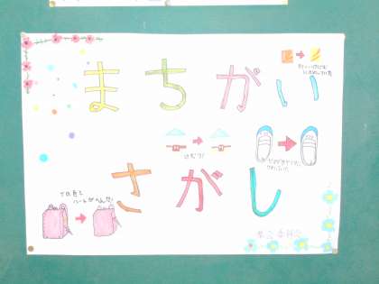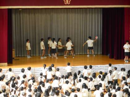 今朝の児童集会は、集会委員会の「まちがいさがしゲーム」でした。学校生活の1場面を集会委員会の人たちが舞台上で2回再現します。1回目と2回目の再現場面の違いを見つけるゲームです。写真の「ドッジボール」の場面は、外野の人数の違いでした。 (校長室より 7月14日)