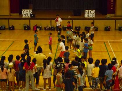 最高のカレーを食べた後、講堂でゲーム大会をしました。「YES/NO」ゲームです。2択問題で最後まで残った人には、景品が渡されました。その後、じゃんけん大会に移り、一層盛り上がりました。      (校長室より 8月20日)