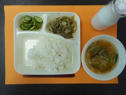 今日の給食は、子どもたちの大好きなプルコギが主菜で、トックとあっさりきゅうり・米飯・牛乳です。プルコギは、たっぷりの牛肉がボリューム感を高めています。しょうが汁やニンニク・コチュジャン・ごま油なども使用した味と香りの豊かな一品で、食材に下味をつけて焼き物機で焼いています。調理中もおいしそうな香りが給食室の周りに漂っていました。トックの入ったスープときゅうりの組み合わせは、米飯にぴったりの献立です。モリモリ食べて、暑さを吹き飛ばしてほしいですね。