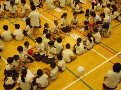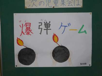 急に雨が降ってきたので、本日の児童集会は講堂で行われました。今日は、爆弾ゲームです。音楽が流れている間、ボール(爆弾)を順に回していきます。音楽が鳴りやんだ時にボールを持っている人が爆弾を持たされてしまうというゲームです。縦割り班で、楽しくゲームをしていました。(校長室より 9月8日)