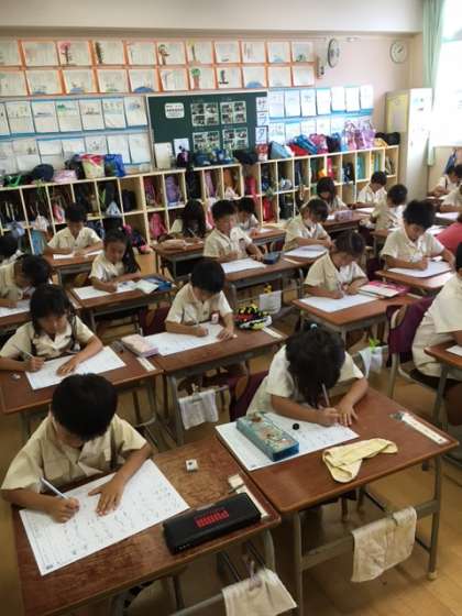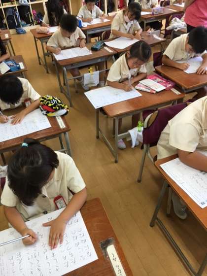 昨日の5時間目、1年生の教室で書写の学習をしていました。黙々とひらがな・カタカナの練習をする子どもたちでした。練習を始めると、教室内には扇風機が回る音と鉛筆を動かす音しか聞こえなかったです。それぐらい集中して、学習をしていました。ピリッとした教室の雰囲気に思わず感心してしまいました。