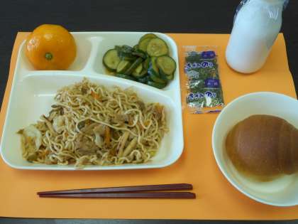 本日の給食メニューは、焼きそば・きゅうりの辛みづけ・みかん(冷凍)・1/2黒糖パン・牛乳・きざみのりです。焼きそばには、豚肉、いかの他にんじん、たまねぎ、ピーマン、キャベツの野菜が入っておりバランスのとれた一品でした。9月9日のクイズの答えは、梨はバラ科の植物です。(校長室より 9月12日)
