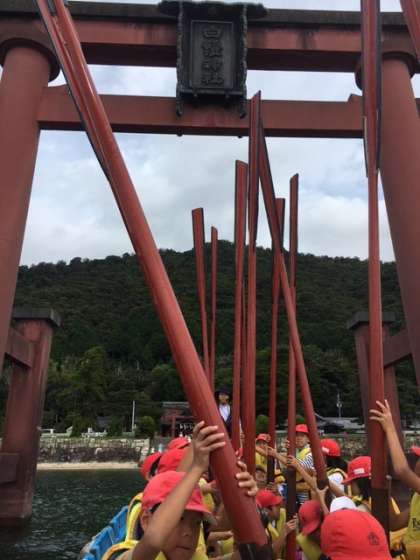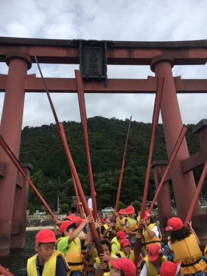 2日目のメイン行事「カッターでの鳥居くぐり」は、午前の2艇が、無事に通り抜けることができました。子どもたちの「ヤッター!」という喜びの声をお届けできないのが残念です。午後の活動も予定通りにできますように!