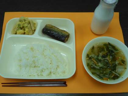 本日の給食メニューは、さんまのさんしょう焼き・すまし汁・高野どうふの卵とじ・ご飯・牛乳です。高野どうふの卵とじは、卵アレルギー児童には液卵を流し込む前の状態で提供しています。(校長室より 10月4日)