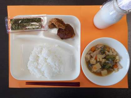 今日の給食は、味噌カツ・鶏肉と野菜の煮物・焼き海苔・ごはん・牛乳です。
