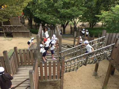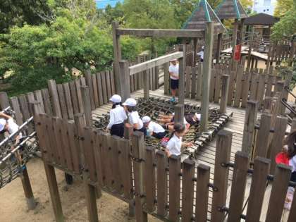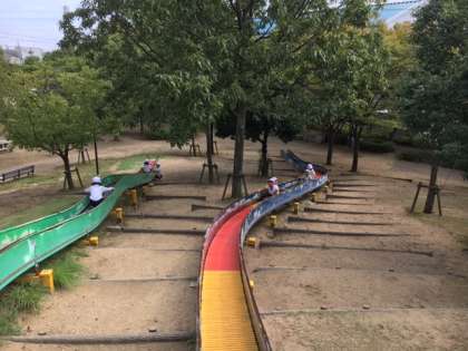 広場には巨大な木製のアスレチック「わんぱくとりで」や、長いローラーコースターがあり、子どもたちは歓声を上げながら走ったり跳んだり滑ったりで、大はしゃぎでした。