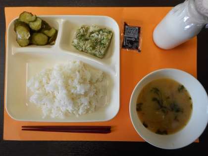 お好み焼きは、野菜と卵のシンプルな材料で作られていました。配食後に各自でソースをかけて食べます。キャベツの甘みが感じられる献立でした。豚汁は、豚肉と野菜のうまみがたっぷりの味よい汁ものです。きゅうりの甘酢漬けは、甘酢にしっかりとつけられて十分味のしみ込んだ副菜でした。今日の給食もおいしくておなかいっぱいです。ごちそうさまでした。