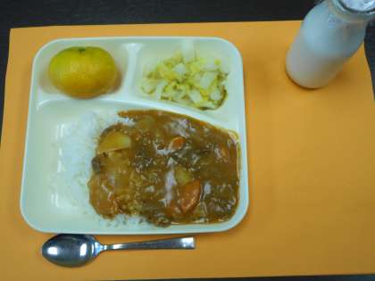 本日の給食メニューは、ハヤシライス・はくさいのピクルス・みかん・牛乳です。ハヤシライスのルウにはトマトピューレ、ケチャップが入って、まろやかでこくのある味に仕上がっていました。 (校長室より 10月28日)