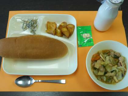 本日の給食メニューは、中華煮・大学いも・ミニフィッシュ・大型コッペパン・牛乳・マーガリンです。大学いものみつは、砂糖・塩・こい口しょうゆ・水を煮て作ったものです。程よい甘さで後味もさっぱりしていました。(校長室より 10月31日)