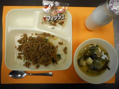 本日の給食メニューは、ビビンバ・わかめスープ・アーモンドフィッシュ・牛乳です。ビビンバは、こい口しょうゆ、コチジャンで味付けされており牛・豚挽肉とだいこん・もやし・にんじん・ほうれん草がうまく合わさりとてもおいしくいただけた。(校長室より 11月8日)