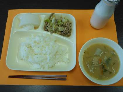 本日の給食メニューは、豚肉とまいたけのいためもの・つみれ汁・ういろう・ご飯・牛乳です。ういろうは、上新粉、砂糖、水を混ぜ合わせ30分間焼き物気で蒸したものです。程よい甘さで、上品な味に仕上がっていました。(11月9日)