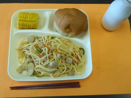 本日の給食メニューは、チキントマトスパゲッティ・蒸しとうもろこし・1/2こくとうパン・牛乳です。チキントマトスパゲッティは、にんにくの香りとトマトの酸味が食欲を増進させるものであった。(校長室より 11月22日)