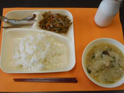 本日の給食メニューは、焼きししゃも・にゅうめん・きんぴらごぼう・ご飯・牛乳です。給食に出るししゃもは、「カラフトシシャモ(カペリン)」と呼ばれ、北大平洋北部から北極海、北大西洋北部にかけて住んでいます。本日のししゃもは、料理酒で下味をつけ蒸し焼きにしたものです。柔らかく食べやすかったです。(校長室より 11月25日)