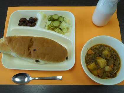 本日の給食メニューは、牛肉と野菜の洋風煮・キャベツときゅうりのサラダ・うずら豆のグラッセ・レーズンパン・牛乳です。うずら豆のグラッセは、うずら豆を30分間熱湯にひたした後、砂糖・塩・バターを加え90分間、焼き物機で煮たものです。少し甘くて食べやすい味に仕上がっていました。(校長室より 11月28日)