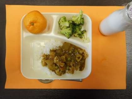 本日のカレーライスは、大根やレンコンなど冬の根菜がたっぷりと入ったヘルシーな献立でした。ワインで下味をつけた牛肉と大根・レンコン・にんじん・玉ねぎを炒めてから煮込みます。最後にグリーンピースを入れて彩りよく仕上げます。野菜のうまみがルゥと合わさりおいしいカレーライスでした。緑のきれいなブロッコリーも酸味が少なく食べやすい味付けに仕上がっていました。野菜のおいしさが引き立つ献立でしっかりと食べることができました。冬においしくなる根菜をしっかりと食べて健康な毎日を送りたいですね。今日もおいしくいただきました。ごちそうさま!