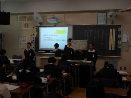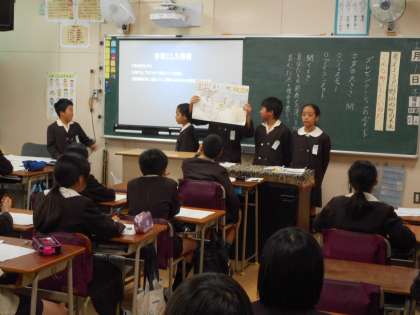 昨日、6年生2組で学習発表会で発表した「アイラブ 野田」を発展させた形で「未来の野田の町」について、パソコンのパワーポイントを使って、プレゼンテーションをしました。中央市場の屋上に遊び場を作ることや野田小学校の地下に町のみんなが買い物できるショッピングモールを作ること、迷路のような路地を利用し「きもだめし」ツアーを催すなど素晴らしいアイデアを考えてくれました。地域の小西連合町会長様と福島区役所の吉野様にもきていただき、子どもたちの発表を聞いていただきました。(校長室より 12月2日)