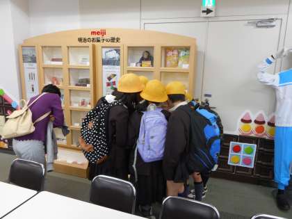 「カール」の中には、普通のカールの形ではなく「カールおじさんの顔」や「星」などのラッキーカールの入っている袋もあるそうです。また、きのこの山のチョコレート部分は、ビターとミルクの2層になっていることなどのお話を聞きました。できたての「カール」も試食させていただきました。(校長室より 12月8日)