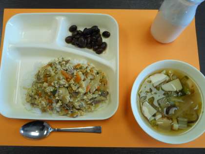 今日から3学期の献立が始まりました。本日の給食メニューは、他人丼・すまし汁・黒豆の煮もの・牛乳です。「黒豆の煮もの」は、お正月のときに食べる料理の一つです。柔らかく煮られており、おいしくいただきました。(校長室より 1月11日)
