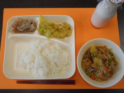本日の給食メニューは、さつまいもと豚肉の甘辛煮・れんこんの米粉てんぷら・キャベツのおひたし・ご飯・牛乳です。献立のねらいは、○天ぷらを米粉にした ○肉じゃがのじゃがいもをさつまいもに変えた ○さっぱりしたおひたしにした ことです。じゃがいもをさつまいもに変えたことで、甘みのある煮物になっていました。寒い季節に合った1品であったと思います。(校長室より 1月17日)